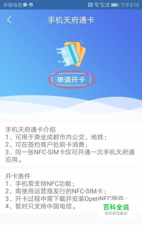 开卡流程: 登陆APP后,点击首页的“手机天府通卡”,根据提示申请开卡,开卡过程中,系统会提示,打开手机Open-NFC关联启动,不同机型打开关联启动途径略有差异。 第一步:点击“申请开卡”根据提示下载电信运营商组件