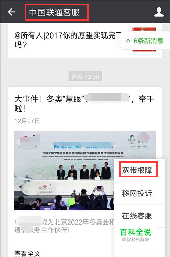 进入“中国联通客服”公众号,点击下方菜单栏“客户服务”,选择“宽带报障”