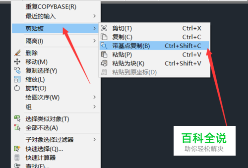 然后,进行带基点复制,如图所示,点击鼠标右键,然后选中复制,带基点复制,也可以使用快捷键:CTRL+SHIFT+C;粘贴的时候可以选中粘贴或者粘贴为块。