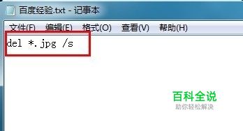 然后打开这个空白文档,输入“del *.jpg /s”(去掉引号,注意空格),星号点后面那个扩展名可以改成你要删除的其他格式的文件的扩展名,确定退出。