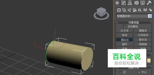 打开3d max软件(这里用的3d max2010版的软件)。可看到四个视图窗口,在窗口的右边,鼠标左键单击面板的【标准基本体】按钮,选择【圆柱体】,在透视图上,拖动绘制一个圆柱体出来,并旋转90度,如下图所示。