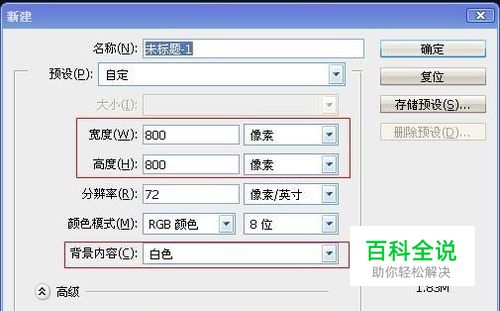 新建一个PS图层,宽度:800px,高度:800px,背景内容:白色