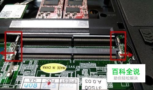 首先教大家怎么拆内存,如图 我们只需要把内存卡槽2边的银色金属卡扣往外轻轻扳动一下,内存就会自动弹出 我们取下来就好。(参考图片中的 箭头示意)