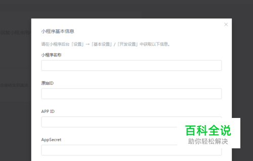 第二步:登录后台 — 设置 — 微信小程序 — 接入微信小程序,填写小程序名称、原始ID、appid、appsecret,点击提交。 小程序名称、原始ID:微信小程序后台设置 — 基本设置; appid、appsecret:微信小程序后台设置 — 开发设置;