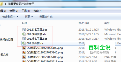 然后我们在该文件夹内建立001.文件树.xls,001.改名信息.xls,001.提名工具.txt,001.改名工具.txt,然后将2个txt文件后缀更改为.bat。并将需要修改的图片复制进去。