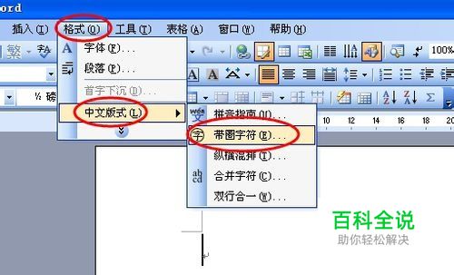 打开一个WORD文档,打开菜单中的“格式”--"---"中文版式"---"带圈字符"
