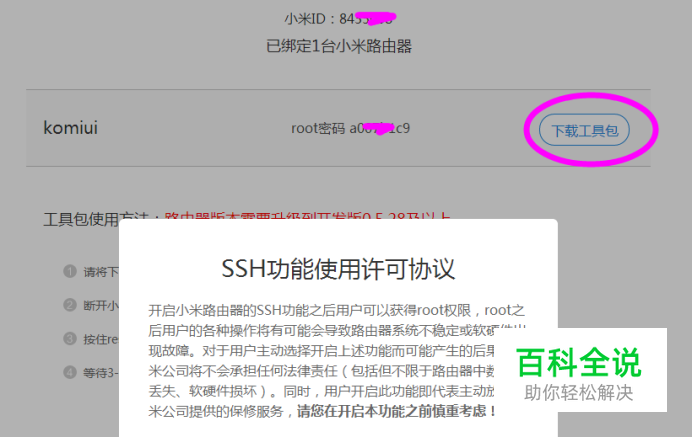 下载“开启ssh工具” 访问MiWiFi开放平台 http://www1.miwifi.com/miwifi_open.html 点击“开启ssh工具” 依次点击“下载工具包”“接受”,需要注意的是,协议中已经写明,开启ssh后得到root权限,同时意味着放弃保修服务。