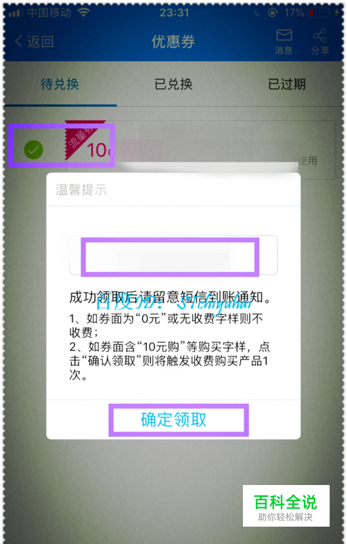 点击底部自己兑换,也可以转赠给其他人,有些优惠券是免费的,有些需要付费,需要自己看清,点击后在弹出的界面中输入自己的手机号码,然后点击确认领取。