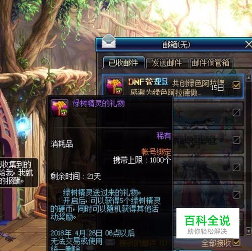 浇水两次即可选择领取礼物,点击之后即可收到礼盒邮件,打开绿树精灵的礼物即可获得5个绿树精灵的硬币以及随机其他奖励。