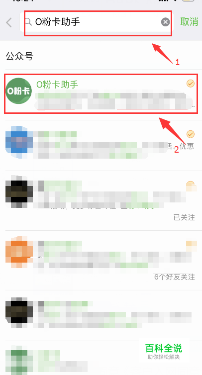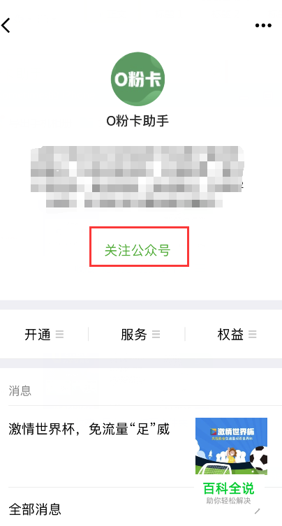 ①打开微信,添加“O粉卡助手”微信公众号>>选择“关注公众号”;