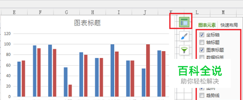 第二步点击第一个图表元素按钮,可以当前使用的图表元素,坐标轴,图表标题,图例,网格线等,如下图所示: