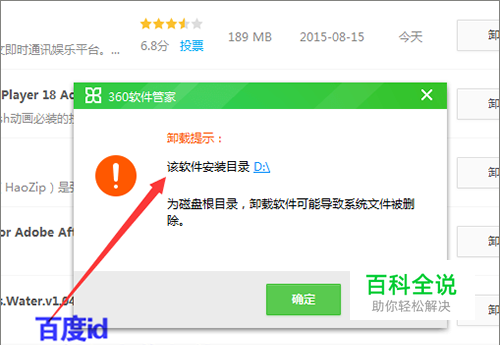 当我们在安装软件的时候,如果不新建一个它的安装目录文件夹,而是直接把它安装到计箕机d或其的盘中,再去卸载软件的时候,就会出现这样的卸载提示。如果直接点击确定。它仍然不能卸载。