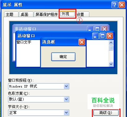 在桌面点击右键,属性,打开显示属性“外观”,点击下方“高级”