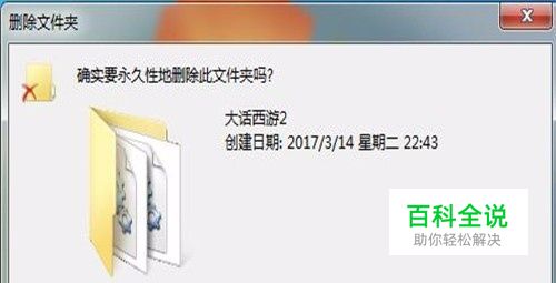 我们鼠标右键点击这个大话西游2的文件夹,会弹出一个选项卡,我们在里面点点击“删除”,弹出一个确认对话框,点击“确定”,即可将大话西游2文件删除到“回收站”。