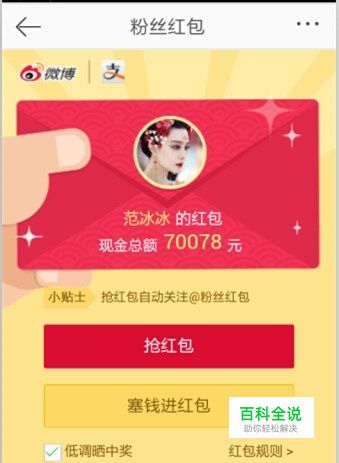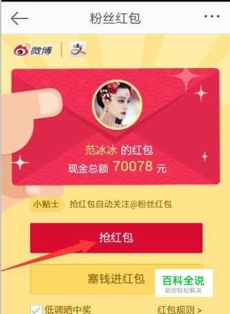 如果点击了某个明星右边的抢红包按钮,就会来到这个明星对应的粉丝红包页面,如果红包没有被别人抢完而自己微博账号没有用完每天抢红包限额的话,就可以直接看到红包下面还有一个“抢红包”的按钮,直接点击这个按钮进行抢红包。(如下图)