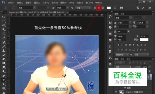 用Photoshop打开导出的静帧,建立一条50%的竖直参考线 打开文字录入工具,选中“居中”选项(图中红点区域) 然后在我们需要的位置键入我们需要加入的字幕,因为此处只做为效果预览,可以随意键入需要的文字,也可以键入之后数一下该视频具体一行可以容纳多少字,为我们以后准备字幕文件作为参考。 键入文字完成后,为文字添加效果,用作对白字幕只需要简单处理一下就可以了,在这里我用的是: 混合选项:外描边:1px 和很少的投影