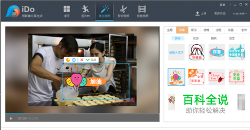 美化视频 需求对象:自拍爱好者、淘宝店主、视频制作爱好者等 可做成: 可美化视频,使视频更丰富形象 美化视频1-增加字幕: 第一步:点击右侧素材区字幕,字幕自动添加到左侧预览区; 第二步:点击字幕顶端的“完成”按钮,添加字幕完成;