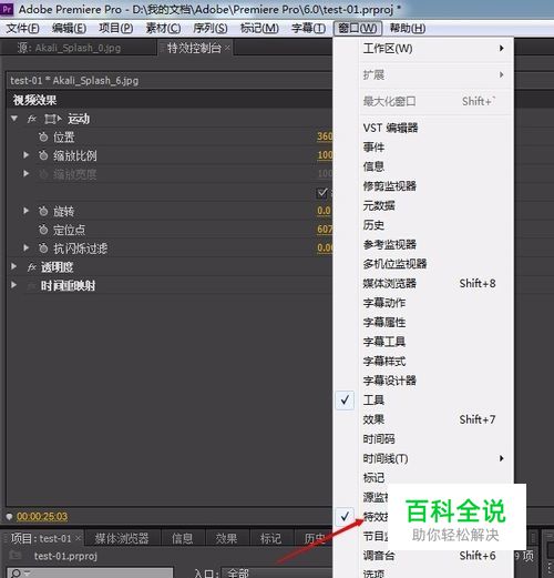 2.请大家打开premiereCS6菜单栏,打开窗口选项,找到“特效控制台”,打勾。 提示:这一项是必要操作