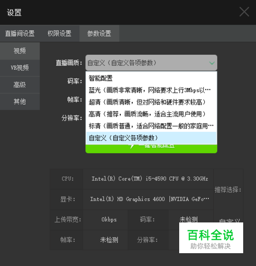 基本参数包含直播参数的基础设置,其中根据个人硬件设备不同可以进行选择,还可以自动配置,具体如下: