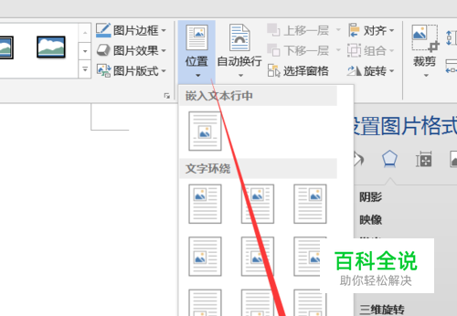 接下来输入一段文字,同时将图片的“对齐方式”设置“浮于文字之上”。选中图片,切换到“格式”选项卡,点击“位置”下拉列表,从中选择“其它布局选项”按钮。