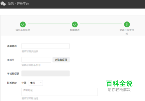 点击激活链接以后激活成功,进入到完善开发者资料窗口,在窗口上面输入开发者的姓名,手机号码,然后通过手机获取一个验证码,输入验证码,再输入详细的地址,点击完成如图所示:
