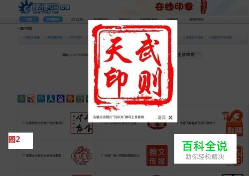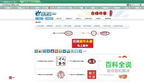 一.不透明图章制作: 1.上网地址栏输入“在线印章”,打开在线印章网页。点选中意图章样式(此处我选择“红色个性图章设计生成”样式),输入字符“武则天印”,选取尺寸大小为“大”如图1.