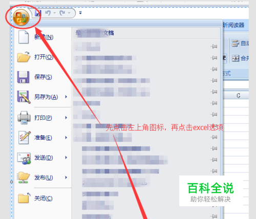 点击左上角的图标,出现菜单后,点击下面的“excel选项”