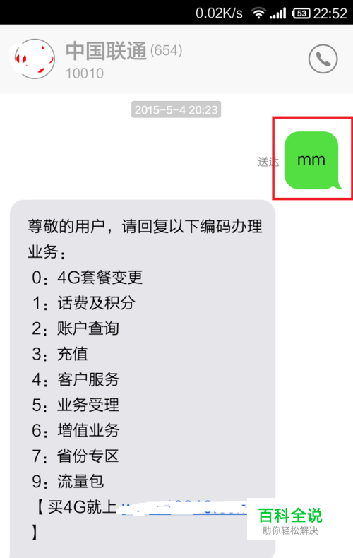 1.第一步给10010发送“mm”内容的短信,耐心等待回复
