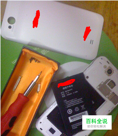 首先将我们的手机的后盖打开,将里面的电池拿出来。