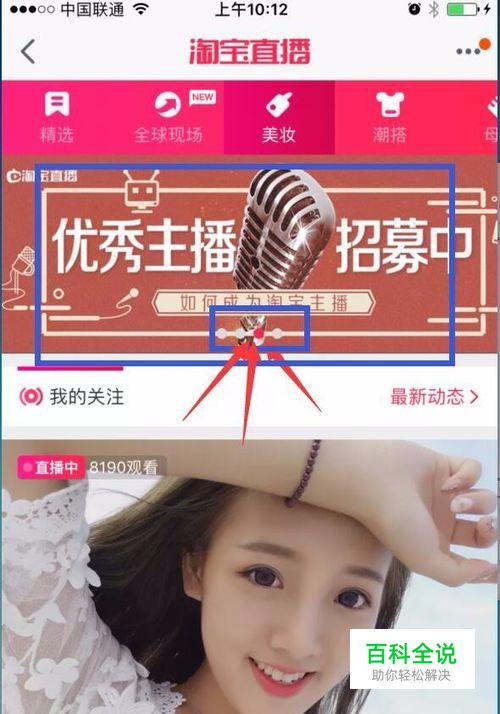 在打开的“淘宝直播”页面上方的滚动海报位置,滚到海报,找到“优质主播招募中”海报并点击