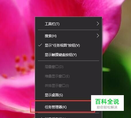 首先,请大家在Win10系统桌面上右键点击任务栏,在任务栏上弹出的菜单中选择“ 任务管理器”选项,打开Win10系统任务管理器主页面。