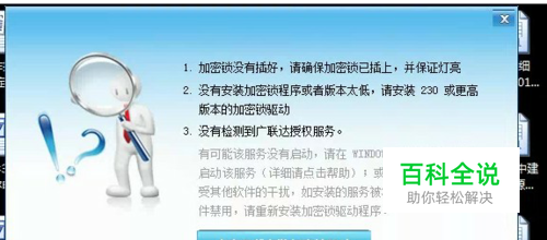 软件打开报错:检测不到加密锁。1.加密锁没有插好,请确认加密锁已插上,并保证灯亮;2.没有安装加密锁驱动或者版本太低,请安装230或更高版本的加密锁驱动;3.没有检测到加密锁授权服务。点击下载安装加密锁驱动,如图:如何处理?
