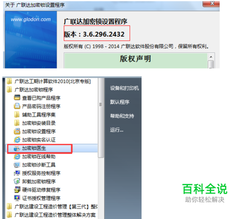 解决方案二:检查安装的是不是最新版加密锁驱动,如果不是,需要安装最新版加密锁驱动程序,安装前退出杀毒软件,开始---所有程序---广联达加密锁程序---加密锁设置程序;