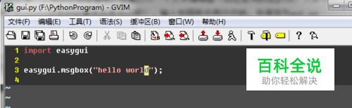 接下来我们使用easygui创建一个简单的消息框。任意打开一个文本编辑器(我这里用的是gvim,大家可以随便用,windows自带的记事本也是可以的),输入如图所示两行代码,并保存为gui.py