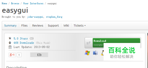 我们首先下载一个类库easygui,它是一个Python用于简单开发图形化界面的类库,打开easygui的下载网页http://sourceforge.net/projects/easygui/?source=directory,点击绿色的下载按钮下载。下载好后是个后缀名为zip的压缩文件,先解压缩,然后把其中的easygui.py放到python3安装目录中的Lib文件夹中,如D:\Python33\Lib