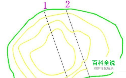 使用断面法计算方量,第一步需要布置断面线,布置断面线时多条剖面尽量平行。断面线间距越小,计算出的量就越准确。下面我们通过计算下图中1、2两条线中的方量来了解断面法计算方量的过程。