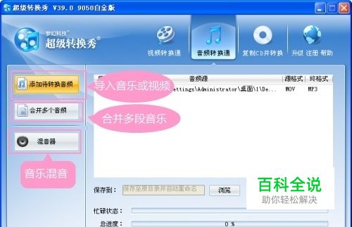 导入需剪接的音乐或视频文件 如下图,要实现剪接音乐,需要使用的是超级转换秀的“音频转换通”。在音频转换通选项卡面板点击“添加待转换音频”按钮,导入要剪接音乐的音乐或视频,仅在导入要转换的音视频文件这一环节上,软件就人性化的提供了多种方式。对于爱好制作音乐的朋友,还可以灵活使用它的合并多个音频、混音处理等功能,制作各种个性音乐。