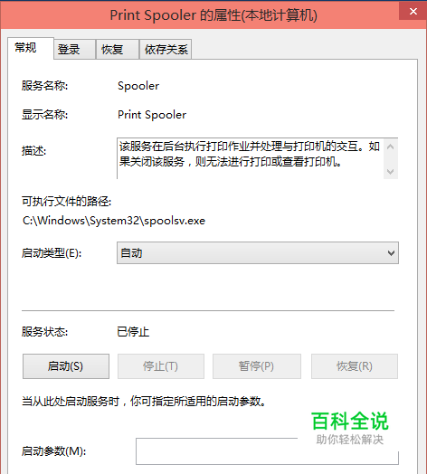 或者双击Print Spooler打印机服务,在弹出Print Spooler属性对话框里也可开启和关闭打印服务。如下图所示。