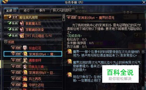 登录游戏之后,按F1打开任务窗口,如下图所示。在任务窗口里有 成就 选项,点击 成就 有任务:深渊派对EP4-魔界的混沌。接取这个任务。