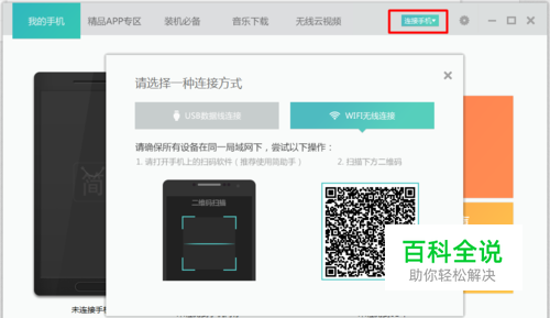 首先,电脑中必须安装“暴风简助手”程序,通常在安装了暴风影音程序后将自动安装该工具。运行“暴风简助手”,点击右上角的“连接手机”按钮,选择任意一种方式连接手机。