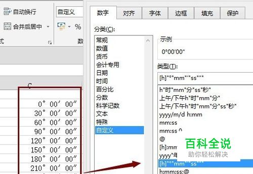 如果想要将角度转换成45°00′00″的格式,可以设置单元格格式为自定义格式,即利用时间格式将其定义为自己的角度形式。如图在类型中输入[h]“°”mm“′”ss“″”或[h]°mm′ss″,确认,其他相同。