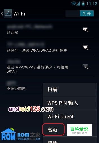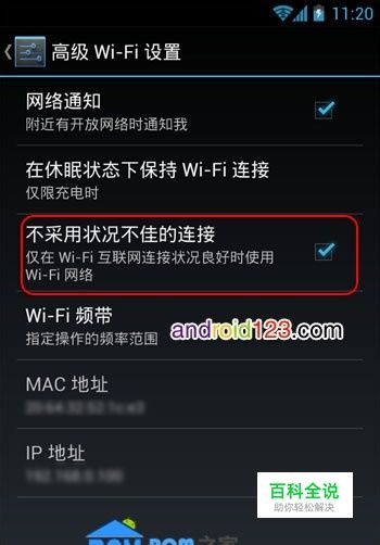 有的时候WiFi扫描出的AP信号质量很差,安卓4.0系统开始可以很方便的屏蔽WiFi信号差的热点。在“设置”的Wi-Fi中,按下Menu菜单键,选择“高级”如图 在“高级Wi-Fi设置”页面中勾选“不采用状况不佳的连接”,对应英文系统的Avoid poor connection