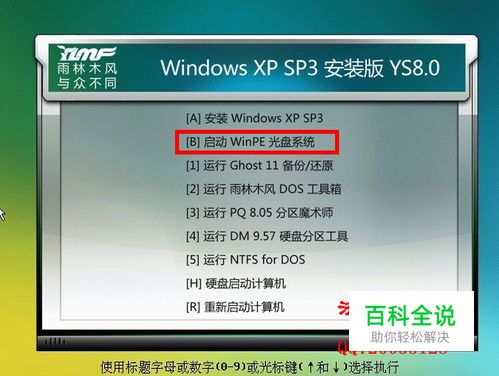 运行XP安装盘,进入PE系统 我这里用YlmF_XPSP3_YS8.0F进入PE系统(因我所下载的YlmF_XP3_YN9.9进入PE系统提示出错,不知道是不是所有的都是这样)。