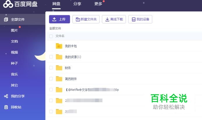 在电脑上登录百度云盘后,我们可以看到我们云盘中有很多文件,一般云盘中可以存储文档、图片、音频和视频,并且不限制单个文件大小,只有云盘总容量限制,容量用完了,可以花钱扩容(但是每年需要续费)。