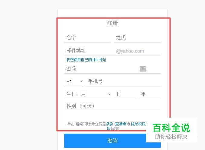 之后,我们按照要求输入姓名、邮箱地址、手机号码、出生年月、性别,然后点击继续,之后就可以了。