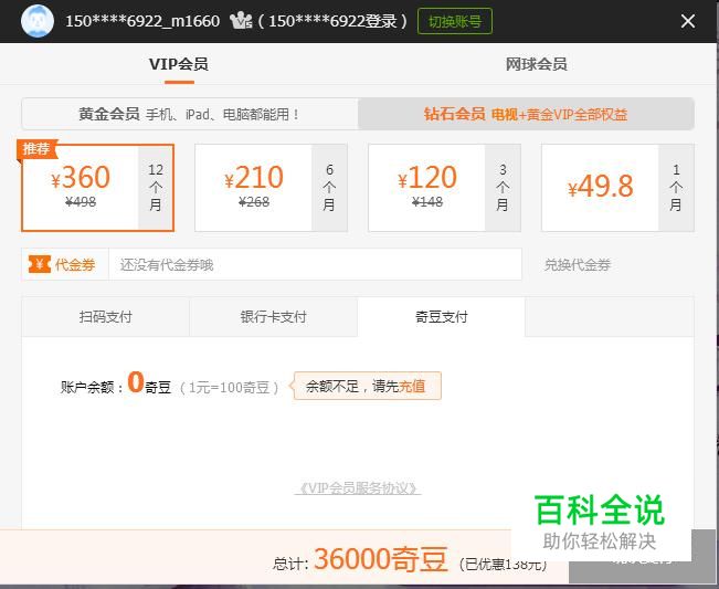 首先登录爱奇艺帐号,点击钻石VIP充值,选择奇豆支付,如图所示
