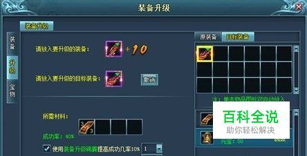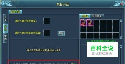 升级步骤: 1、 将低等级的装备放入→升级的装备框中 2、 将高一级的装备放入→目标装备框中 3、 购买升级所必备的“装备升级符”,用装备升级锦囊来提升装备升级的成功率