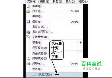 然后我们清除目前已经被记忆下的菜单:在Word中按 “Ctrl+Alt+ -”,注意这里的“-”键是主键盘上等号旁边的键,而非小键盘功能键。此时鼠标指针会变成“一”字形的粗黑形状,用它点击“文件”菜单,然后单击要删除的文档即可(如图)。
