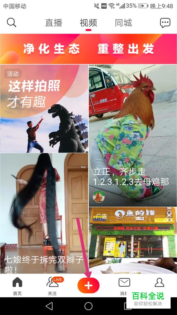 首先打开火山小视频APP,中间有个“+”号,点击它,如下图。