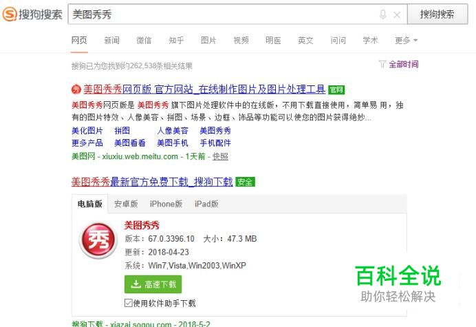 打开搜狗搜索,搜索美图秀秀,将其下载安装到电脑上边,如图所示。